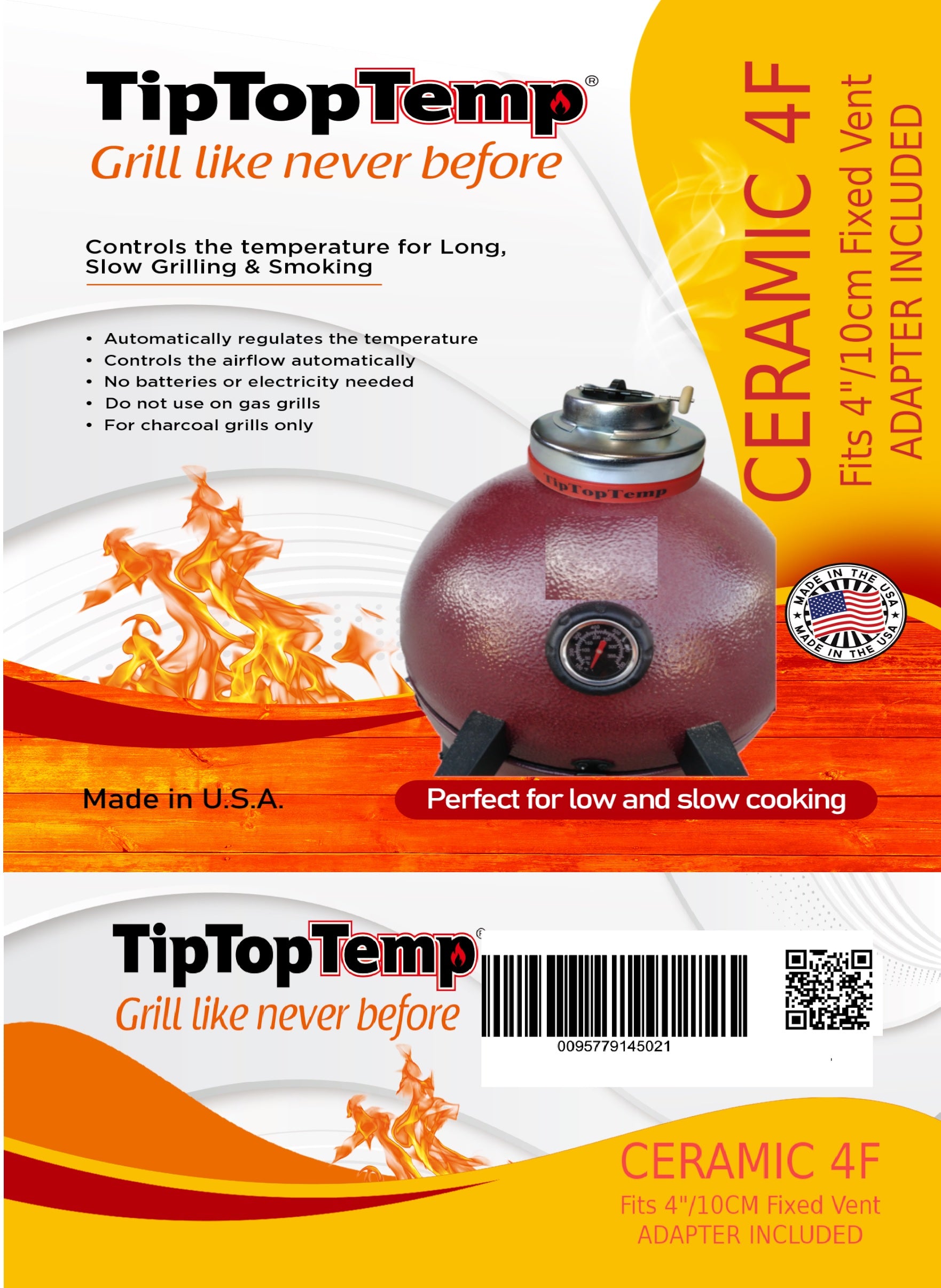 Ceramic 4F is a prepackaged TipTopTemp and includes a 1/2" high temp silicone spacing gasket to fill the gap on the smaller fixed vents. Designed for the Akorn Jr grills.