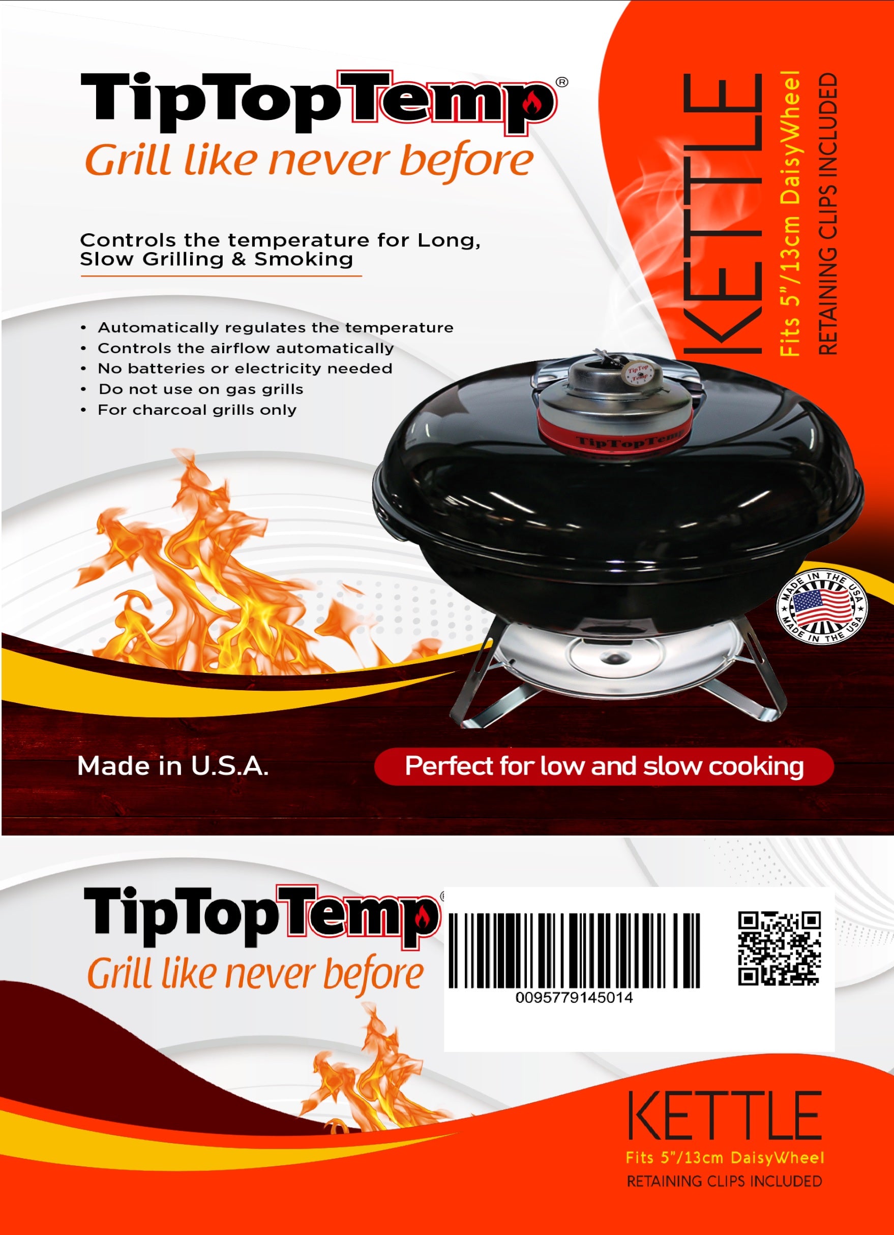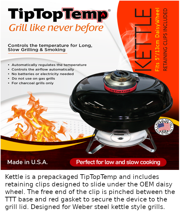 Kettle is a prepackaged TipTopTemp and includes retaining clips designed to slide under the OEM daisy wheel. The free end of the clip is pinched between the TTT base and red gasket to secure the device to the grill lid. Designed for Weber steel kettle style grills.