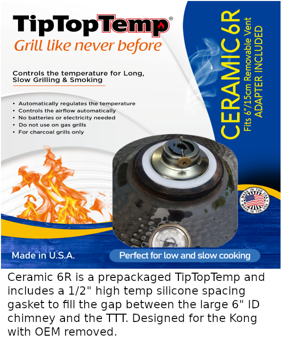 Ceramic 6R is a prepackaged TipTopTemp and includes a 1/2" high temp silicone spacing gasket to fill the gap between the large 6" ID chimney and the TTT. Designed for the Kong with OEM removed.
